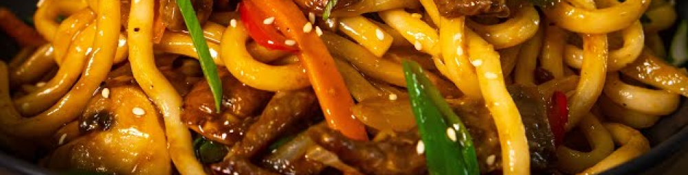 Gebratene Udon-Nudeln mit pikanter Sojasauce & buntem Gemüse